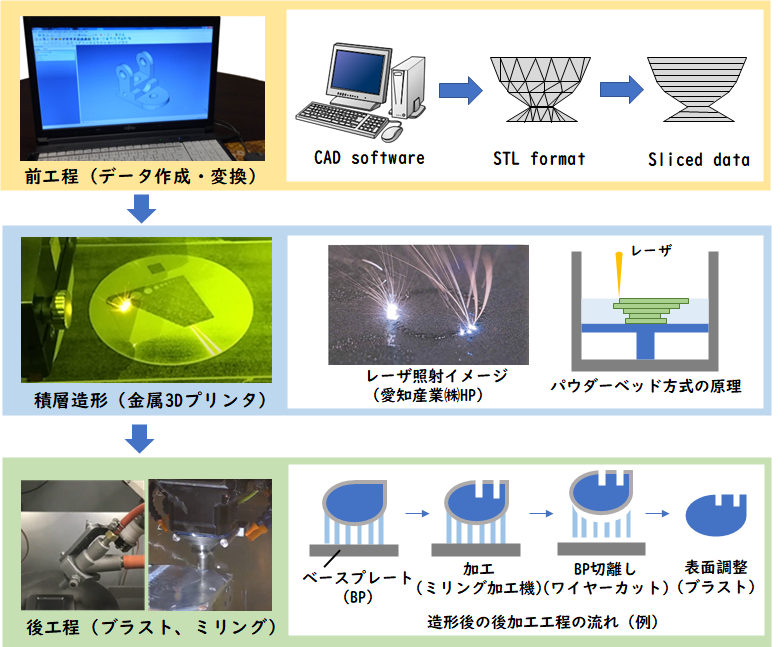 当所の金属3Dプリンタはパウダーベッド方式(Powder bed Fusion:PBF方式)です。利用者にご準備いただいた3D CADデータを用い、金属粉末をレーザで焼き固め、部品等を造形します。当所の3D CADソフト「Solidworks 2022 premium」で、3D CADデータを修正していただくことも可能です。その後、必要に応じてミリング加工機やブラスト装置により切削加工や仕上げの表面加工を行い、ワイヤーカット放電加工機により造形物をベースプレートから切り離します。