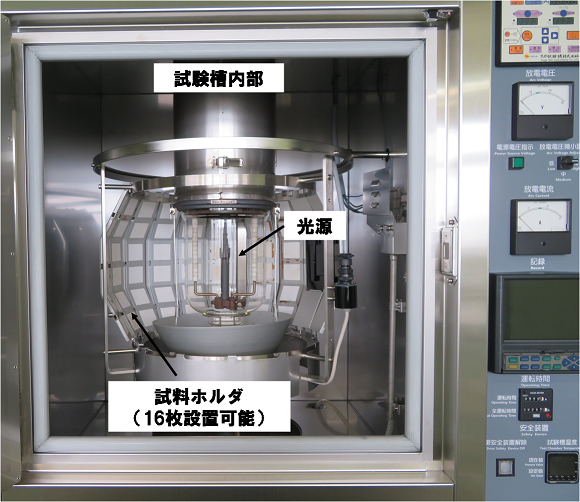 ロングライフフェードメーターは、紫外線に対する製品・部品の耐久性を調べる装置です。本機器で太陽光よりも強力な紫外線を照射することで、劣化現象(変退色や変形の発生、光沢の減少、強度低下等)を促進し、屋外暴露試験よりも短期間で紫外線の影響を評価することができます。自動車部品やプラスチック、ゴム、アルミニウム、繊維といった材質の耐光性評価に用いる試験規格(JIS D0205:1987, JIS K7102:1981, JIS H8685-1:2013, JIS K6404-4:2015,, JIS L0842:2021, JIS Z0237:2009)に対応しています。