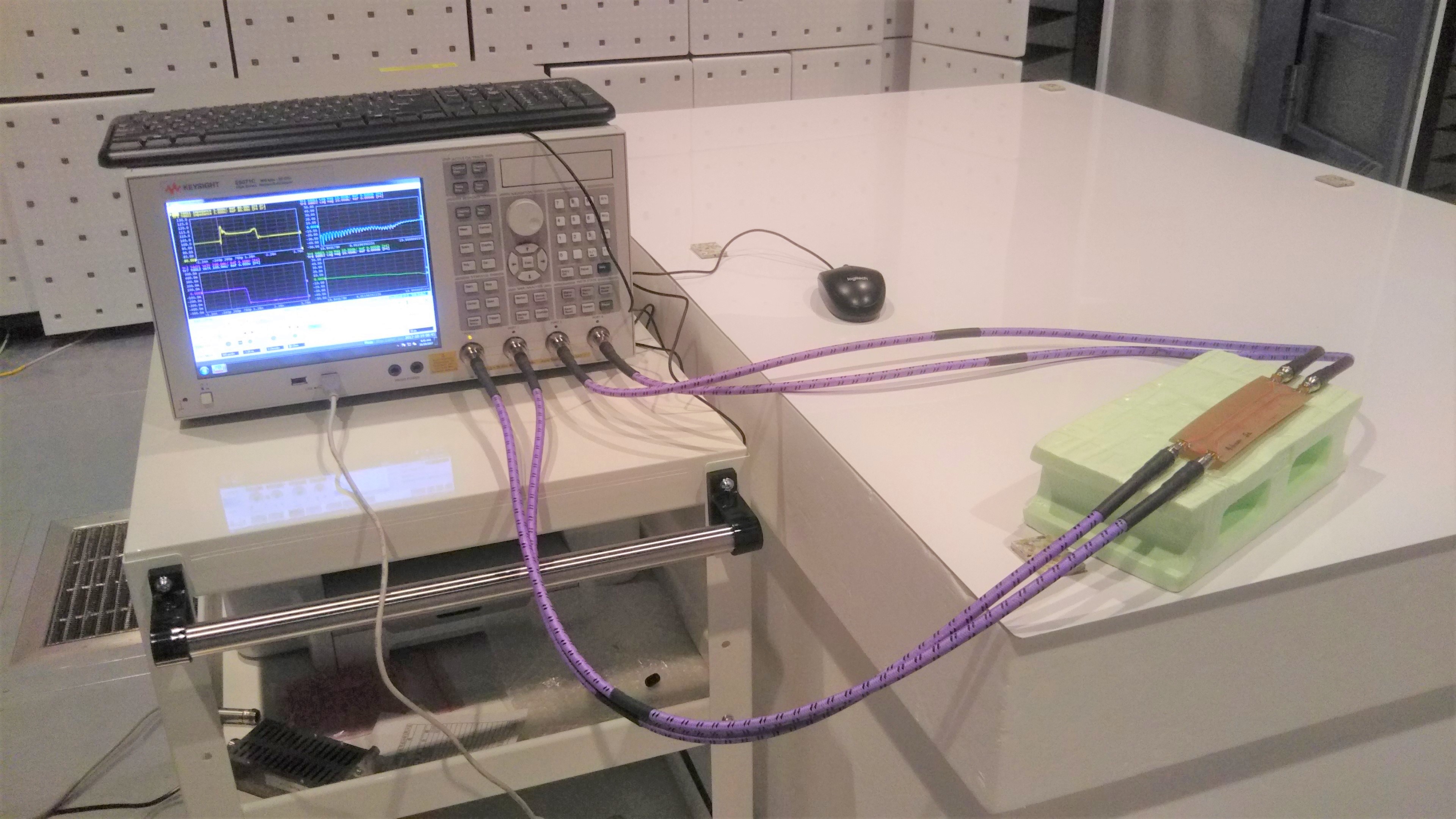 [右]E5071C「試作高速伝送路の信号電装特性評価の様子」